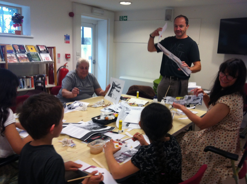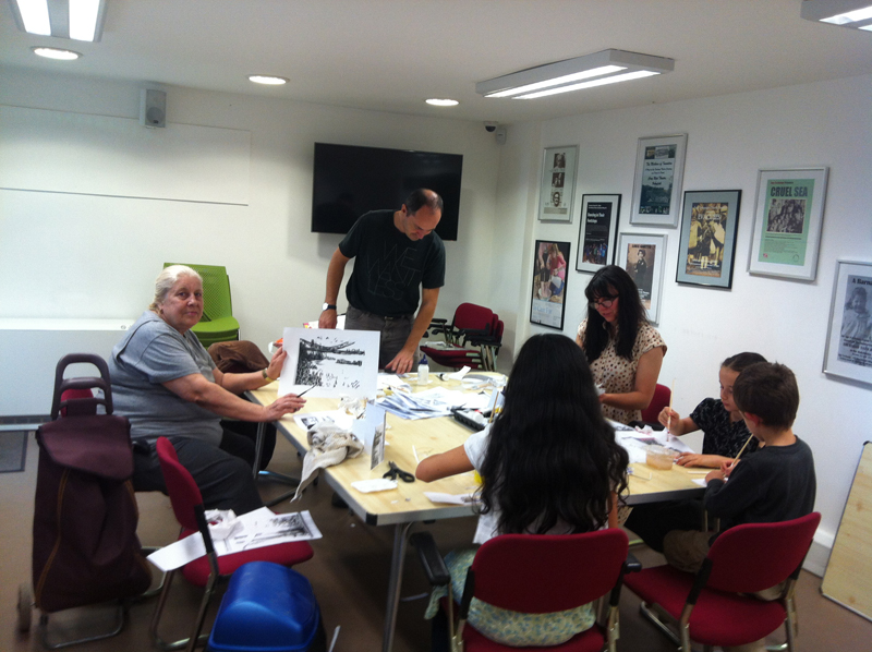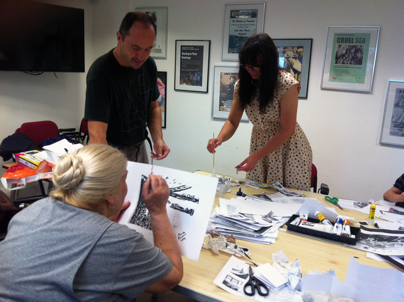 Artists Charlie Fox and Sarah Sparkes working with participants at Age Exchange on collage, drawing and memory..